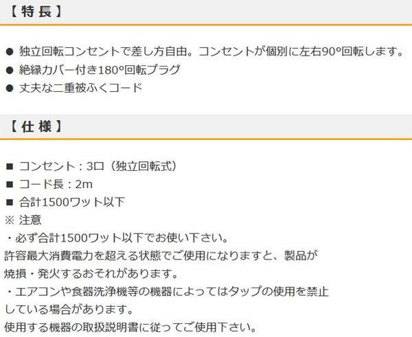 fk094igrjs独立回転コンセントで差し方自由コンセントが個別に左右90度回転します サイズ 個装サイズ:9×22×3cm 重量 個装重量:285g 生産国 中国 コンセントが個別に回転する電源タップ 独立回転コンセントで差し方自由コンセントが個別に左右90度回転します