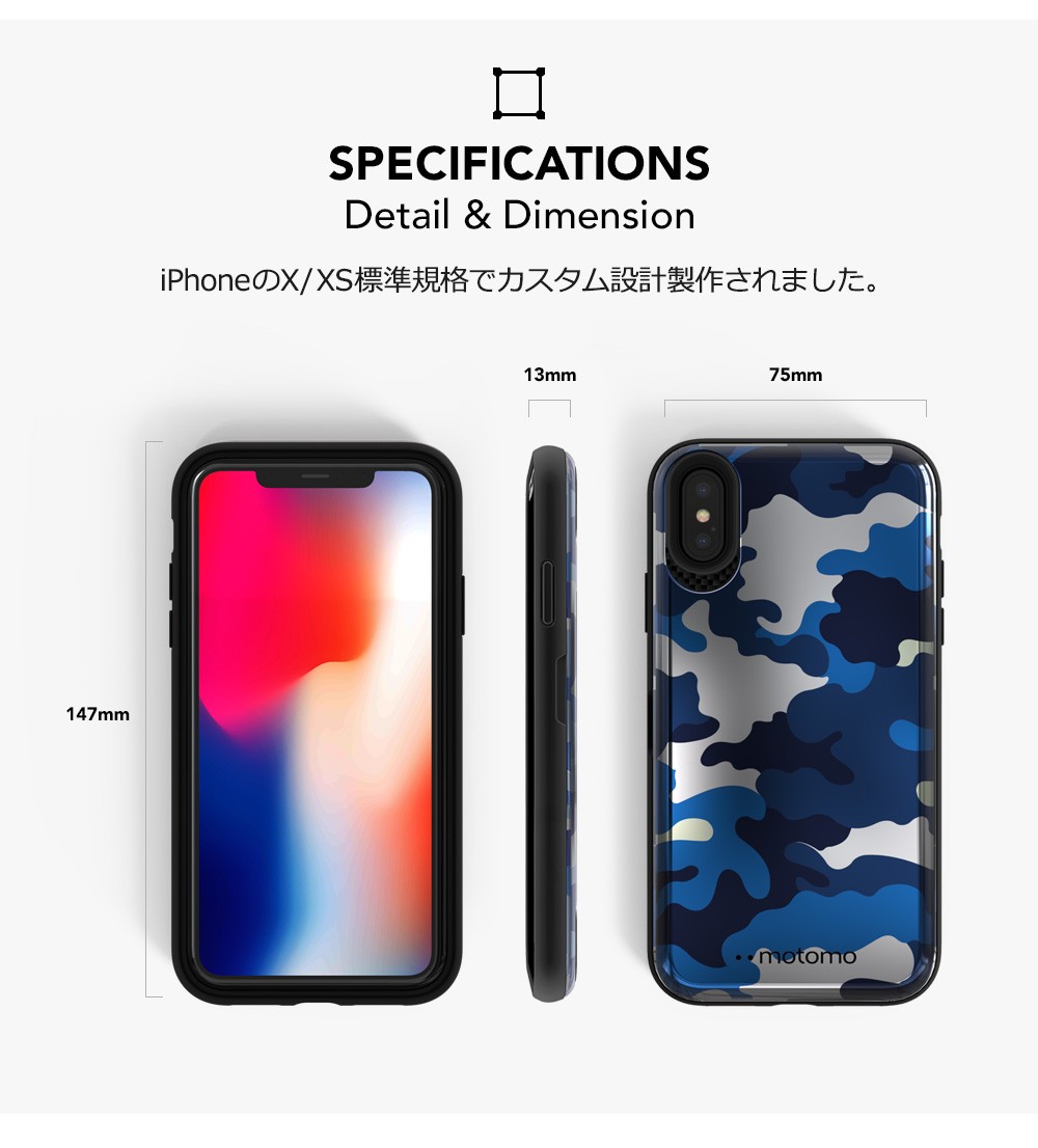 | サイズ | iPhone Xs / X : 75mm x 147mm x 13mm iPhone XR : 80mm x 160mm x 13mm iPhone Xs Max : 83 x 162mm x 13mm |