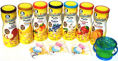 Feature : Includes: Gerber Graduates Puffs Variety Pack of 7 1 Snack Catcher (color will vary) 3 Disposable Crumb Catcher Bib and 5 Sanitizing Hand Wipes Exclusively from Narrow Path Sales. / Flavors Includes: 1 Strawberry Apple Puffs, 1 Banana Puffs, 1 Blueberry Puffs, 1 Peach Puffs, 1 Apple Cinnamon Puffs, 1 Vanilla Puffs and 1 Sweet Potato Puffs.1 of Each Flavor / This Bundle Includes all 7 of the Puffs currently being offered by Gerber / Just right for Crawlers; Perfect for little fingers to pick up and self feed / Good for a Baby Gift, Shower Gift, or Care Package, or everyday use.