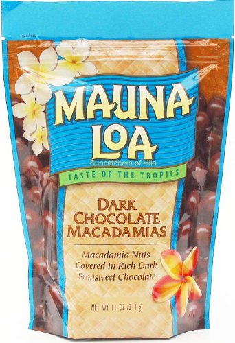 -. Feature : Perfect as a snack, in trail mix, and with fine foods! / Roasted macadamia nuts covered in dark semi-sweet chocolate / Dark semi-sweet chocolate and nuts combination / A Kosher snack / Includes 3 bags of Mauna Loa Macadamias, Dark Chocolate, (11-Ounce Bag)