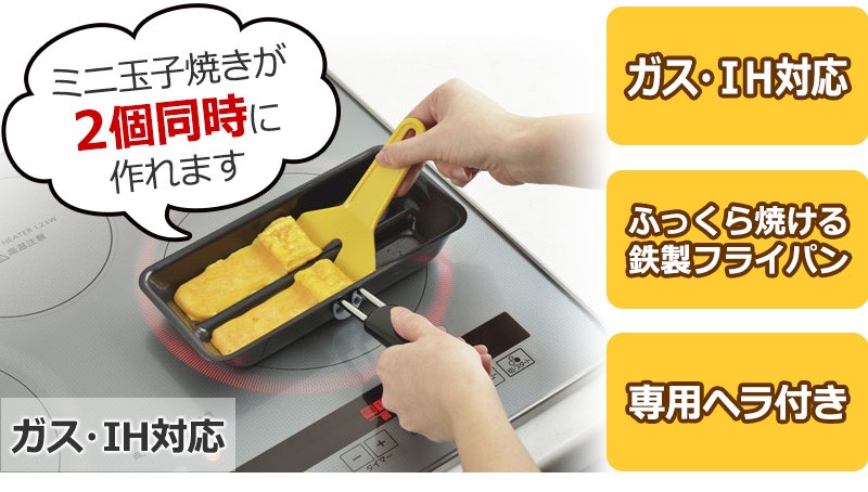 2個同時にくるくる巻いて焼くツイン形状の「専用ヘラ」が付いているので素早く簡単に玉子焼きが作れます。