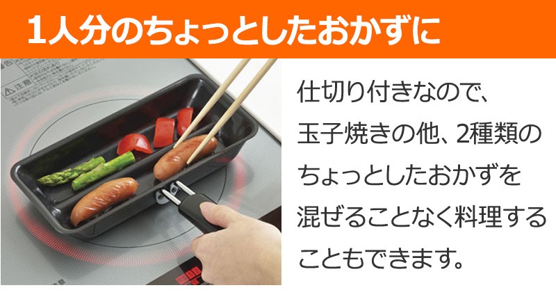 玉子焼きの他、1人分のちょっとしたおかずを仕切り付きなので2種類混ぜることなく料理することもできます。