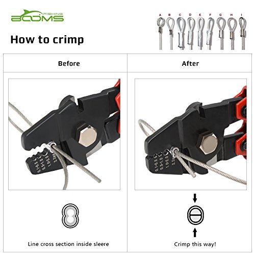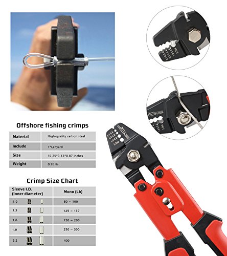 4 Crimping Positions and 2 Hardened Side Cutters:The 4 crimping positions include:0.5-0.1mm, 0.1-0.5mm, 1.0-2.0mm, 2.2mm.It can easy crimp copper / aluminum sleeve and more from 50-450 lb test line
