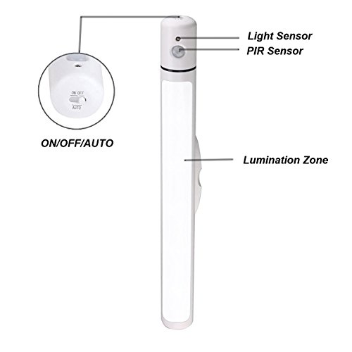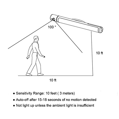 Motion Sensor: Motion-activated LED lighting which is equipped with Light Sensor and PIR motion sensor, light turns on automatically from within 10 feet in 100 degree angle, and stays lit until you leave. Light turns off 20 seconds after you walk out of the sensing range.
