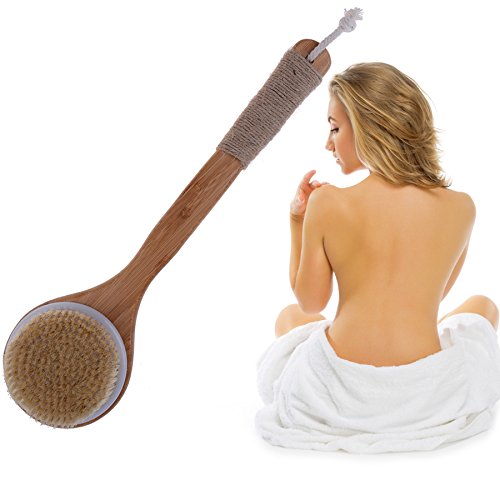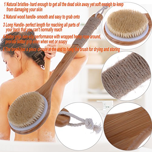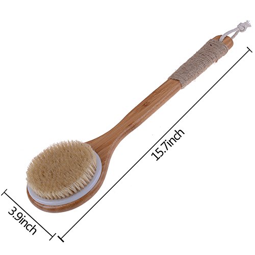 -. Feature : NATURAL BRISTLES- the body dry brush is made of natural hog bristles, soft enough not to scratch but just hard enough to give a good scrub; / LONG WOODEN HANDLE WITH ANTISLIP ROPE- bamboo material made, smooth polished surface with anti-slip rope wrapped on the top of the handle for more comfortable grip that reduces fatigue; 15.7inch in length, nice long brush to get to those hard to reach places / EASY STORAGE- the bath body brush has a lovely little rope so you can hang it up to dry when it's not in use. / DRY BRUSHING YOUR SKIN- the dry body brush can help exfoliate skin, clean pores, improve back acne problem, boost blood circulation, reduce cellulite, smoother skin etc, ideal for women and men to use everyday / MONEY-BACK GUARANTEE- Buytra are backed by 100% guarantee that you are fully satisfied with your product or receive your money back