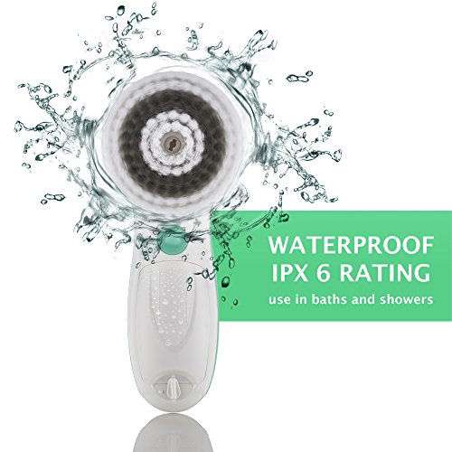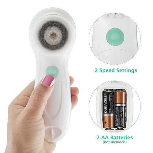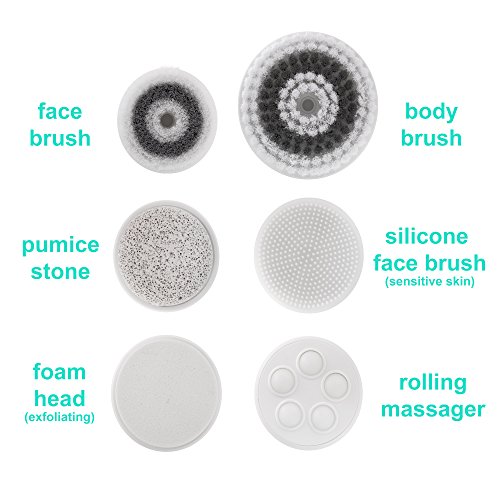 -. Feature : 6 unique brush heads (includes 1 silicone face brush) and detachable handle in 1 convenient set | Multiple functions to meet all your facial and body cleansing needs / Advanced microdermabrasion cleansing system remove make-up, dirt, oil from pores; reduce fine lines & wrinkles; clear blackheads & prevent acne; and renew your skin texture / 2-speed settings with 360° rotary spin allows you to choose between daily deep cleansing and gentle exfoliation / IPX6 water resistant in the shower. Cordless facial cleansing brush powered by 2 AA Batteries (not included) / Softest natural bristles is gentle on your face and body. Suitable for all skin types: normal, dry, oily, sensitive