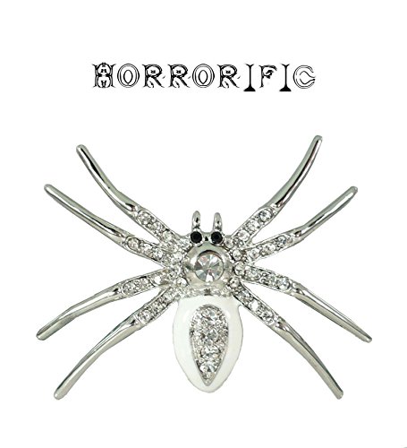 -. Binding : Jewelry -. Brand : Horrorific -. Color : White -. Department : womens -. Feature : Base metal with white enamel and Austrian rhinestones / Pin back with safety C catch / Bold and striking / About 2 inches across and 1 1/2 inches long / Made in China -. Label : Horrorific -. Manufacturer : Horrorific -. Model : 44 -. MPN : 44 -. PartNumber : 44 -. ProductGroup : Jewelry -. ProductTypeName : FASHIONOTHER -. Publisher : Horrorific -. Studio : Horrorific -. Title : Horrorific Halloween Rhinestone Ghastly White Spider Pin Brooch 44