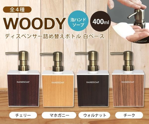 人気のWOODYシリーズから、便利な泡タイプが登場!置くだけで落ち着いた雰囲気になる木目調。前面は木目調、両サイドとバックスタイルはホワイトになっています。 |