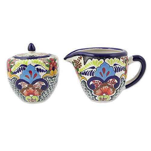 NOVICA Multicolor Floral Ceramic Sugar Owl and Creamer, 8 oz, 'Blue Teziutlan'