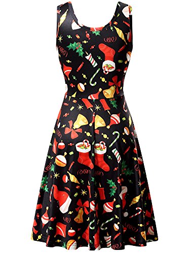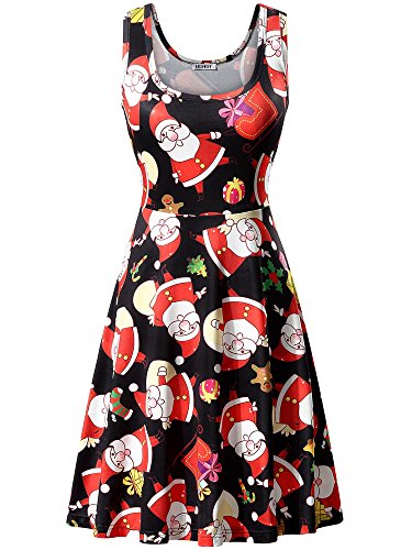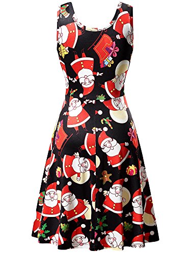 Santa Claus Dress,HUHOT Women Xmas Gift Print Black A Line Sleeveless Party Dress(X-Large, Happy Santa-6)