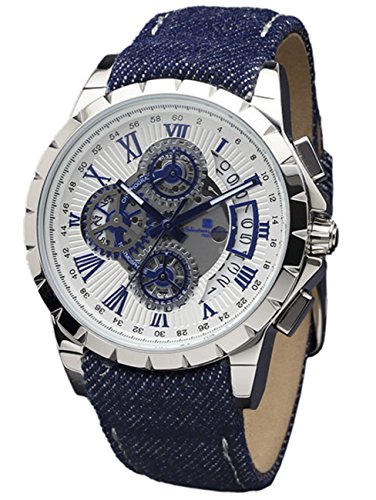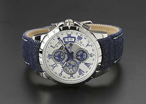 -. Feature : 仕様 クオーツ、10気圧防水、クロノグラフ(1/1秒計、1/10秒計、60分積算計)、日付表示、月差±20秒、カラー:ホワイト×シルバー(文字盤)、ブルー(ベルト) / 素材 ステンレス(ケース)、レザー×デニム(ベルト)、ミネラルクリスタルガラス(ガラス) / サイズ (約)H43×W43×D13mm (ラグ、リューズを除く)、重さ(約)72g、腕回り最大(約)21cm、腕回り最小(約)16cm、ベルト幅最大(約)22mm / 付属品 ボックス、保証書、取扱説明書