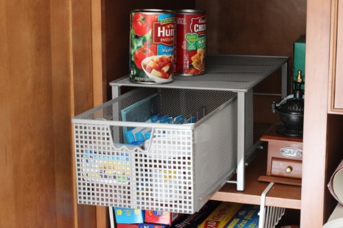 - Feature : Stackable Design w/ the medium basket / Embedded w/ top platform to be the bottom part to stack w/ medium basket / Build by metal and silver painted be a elegant basket / Removable Split Card help you to group items / Slide the basket out to easily access sauces and spices