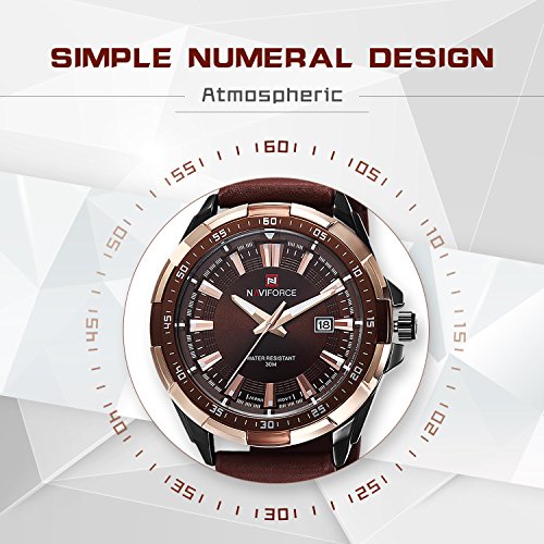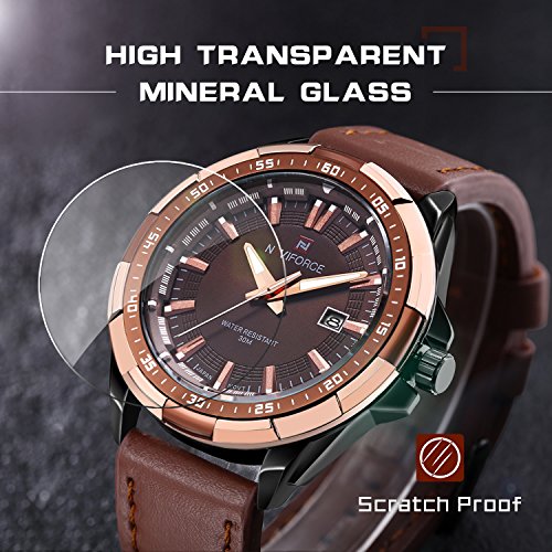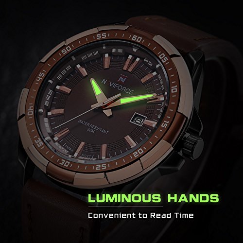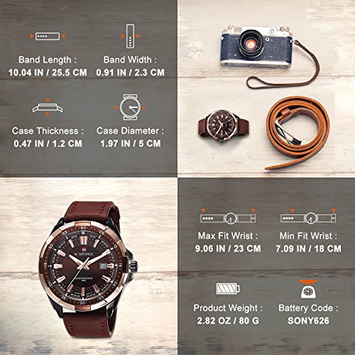"Highlights: • Imported Quartz Movement: provide precise and accurate time keeping • Key Scratch Resistant Watch Face • Locking Fold Over Clasp. Golden Color Metal Scale • Comfortable Leather Band Strap, Super Comfortable to Wear • Stainless Steel Durable Waterproof Case Cover • 98FT / 30M Water Resistant - Daily Use Waterproof, Hand Wash, Rain Day, Sweating. (Please DONOT PULL OUT the button under water) • Classic Business Casual Dress Watch Design. Combines Quality, Leading Edge Fashion, and Value • Stylish Minimalism Design. Look Great and Feel Great With Whatever You Wear Features • Key Scratch Resistant Watch Face • 98FT / 30M Waterproof • Genuine Leather Strap Material: • Case Material: Zinc Alloy • Band Material: Genuine Leather • Mirror Surface: High Transparent Mineral Glass (Key Scratch Resistant) Specification: • Dial Color: • Band Color: Brown • Band Width: 0.87 inch / 2.2 cm • Band Length: 9.84 inch / 25 cm • Case Thickness: 0.28 inch / 0.7 cm • Case Diameter: 1.57 inch / 4 cm • Max Perimeter: 9.13 inch / 23.2 cm • Min Perimeter: 6.89 inch / 17.5 cm • Product Weight: 1.27 oz / 36 g • Battery Code: What Is In The Package: • Men's Quartz Watch x 1 •User Manual x 1 **NOTE**: • Please DONOT Pull Out the Button Underwater. Also avoid the use in extreme hot or cold temperature. • If mist or droplets found inside watch surface, please contact us immediately for maintenance to prevent moisture corrosion of the internal components. • Clean the strap by a soft cloth on regular bases is highly recommended. • Too much water contact will shorter watch life."Feature