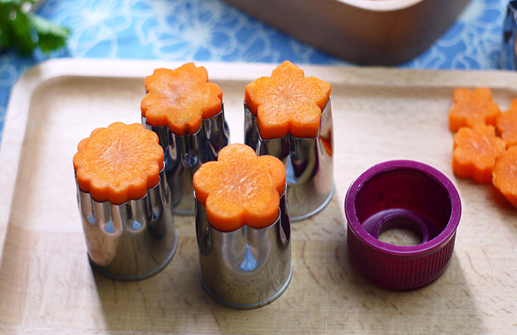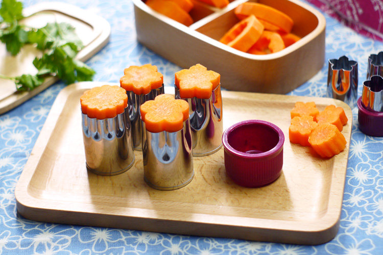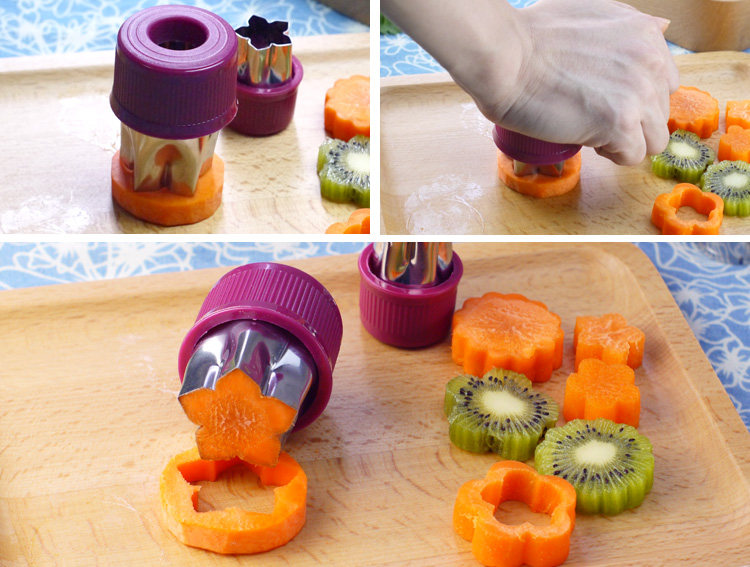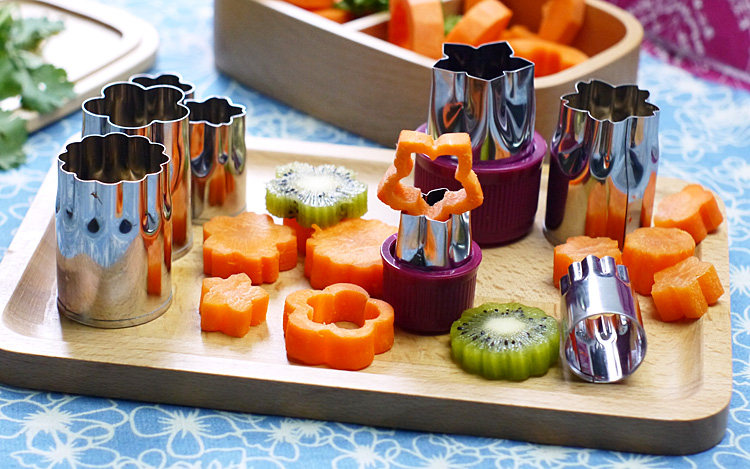 四种形状,大小各4个,总8个加两个护手(切胡萝卜等较硬的蔬果手不疼),可以用来制作成各式花色的蔬菜,水果,或切饼干模,用于装饰便当是极好的。