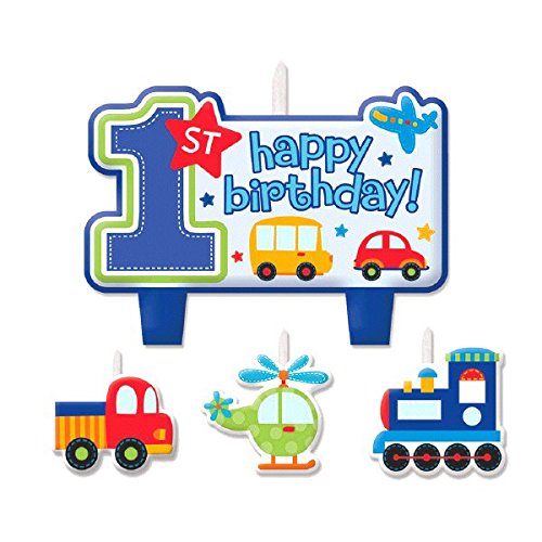 - A set of candles includes three small candles in the shape of a truck, a helicopter, and a train to surround the matching larger candle with a "1st Happy Birthday!" headline