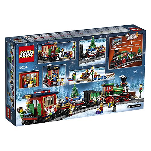 Gather the family for some festive LEGO? building fun with this charming model featuring a full circle of track, boarding platform with bench and lamppost, a Power Functions upgradable train engine with brick-built smoke bellowing from its stack, coal tender, flatbed wagon with a rotating holiday tree, toys and gifts, and a red caboose with a detailed interior and table. The train engine also features large and small red-colored locomotive wheels and the train is decorated with green wreathes, string lights and white tree elements. This LEGO? Creator Expert set includes 5 minifigures. Includes dual building instructions for a perfect family build. Accessory elements include green wreathes, decorative lights and white tree pieces, plus wrapped gift elements and tiny brick-built toys, including a micro train, wind-up car, fire truck, remote controlled robot, sailboat and a spaceship. Upgrade with LEGO? Power Functions (not included) for a motorized engine. To motorize the engine, purchase items 8879, 8884, 88000, and 88002. Instructions can be found in the back of your building instructions. Special elements include small and large red train wheels, dark tan windows, train buffers, cow catcher, white tree elements and roller skates. This set includes over 700 LEGO? pieces, including 16 curved tracks. This set offers an age-appropriate building experience for ages 12+. The Holiday Train in total measures over 4'' (12cm) high, 20'' (52cm) long and 2'' (7cm) wide. Curved rail track diameter measures over 27'' (70cm).