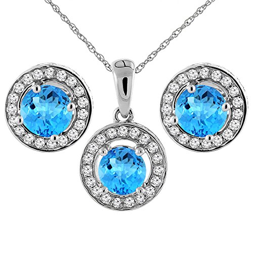 -. Binding : Jewelry -. Brand : Sabrina Silver -. Department : womens -. Feature : 14K Solid Gold / Naturally-vibrant, superior quality color gemstone / High Quality Genuine Diamond Accents / Complimentary gold chain included -. ProductGroup : Jewelry -. ProductTypeName : FASHIONOTHER -. Title : 14K White Gold Natural Swiss Blue Topaz Earrings and Pendant Set with Diamond Halo Round 5 mm