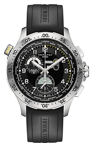 -. Feature : Stainless steel case with a black rubber strap / Uni-directional rotating bezel. Black dial with silver-tone hands and Arabic hour markers. World time scale around the outer rim / Swiss-quartz Movement / Case Diameter: 45mm / Water resistant to 100m (330ft): in general, suitable for swimming and snorkeling, but not diving