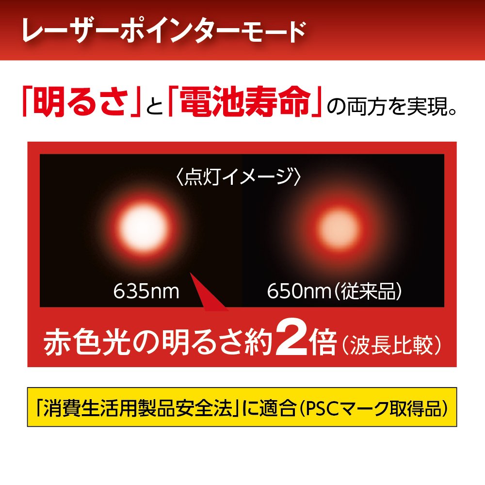● Laser pointer mode: Laser light (wavelength: 635 nm) which is about twice brighter than ordinary red light (wavelength: 650 nm) is adopted to improve the visibility of laser light.