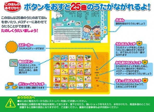 ■うたってたのしいどうようえほん 【収録曲】 01.いぬのおまわりさん 02.ぞうさん 03.どんぐりころころ 04.おおきなくりのきのしたで 05.アイアイ 06.あがりめさがりめ 07.むすんでひらいて 08.いとまきのうた 09.ももたろう 10.はと 11.げんこつやまのたぬきさん 12.ずいずいずっころばし 13.はるよこい 14.かたつむり 15.あかいとりことり 16.だるまさん 17.かもめのすいへいさん 18.てをたたきましょう 19.ちょうちょう 20.むしのこえ 21.あめふり 22.しゃぼんだま 23.こいのぼり 24.きらきらぼし 25.アンパンマンのマーチ