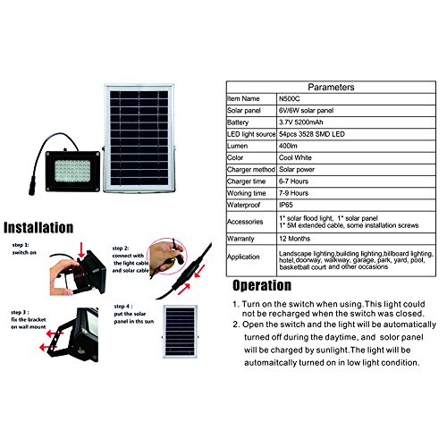 The Solar Light contents 54 pcs LED to provide up to 400 Lumen brightness to illuminate larger area.