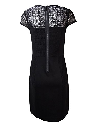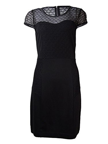 Product DescriptionDress features no lining, illusion neckline, cap sleeves, lace insets, ponte knit fabric, sheath silhouette, and exposed back zipper.0