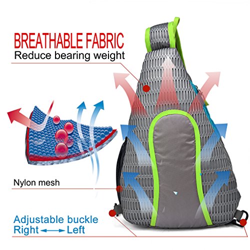 -. Feature : A NEW DESIGN SLING BACKPACK(Right/left switchable strap + 3D decompression designed back pad)- The strap is designed to clip either right or left shoulder, it is great for people who has preference in specified shoulder to pack and for another shoulder to rest. Wearing this travel bag is super comfortable, the pressure and tiredness can be greatly reduced by the thickened shoulder strap and the 3D back pad, No longer feel hot with the breathable net on the back. / ULTRA-LIGHT SLING BAG: never fading & scratch resistant: It is only 7oz with the high quality polyester material, which is tear resistant & water resistant (cannot submerged in water). The sturdy SBS metal zippers went up and down nicely. Plus, the reinforced seams and delicate sewing craft can bring you an excellent outdoor experience. Any parts will hardly come apart or fade as time goes! This is a small crossbody backpack, A handy companion for keeping travel essentials. / 4 SPECIAL FEATURES: 1) Number of ways to wear this sling daypack: shift easily from the chest to the back and vice versa, so getting access on the go is smooth and friction-free. 2) Retractable belt for tighten up the water bottle or hoop your alpenstocks. 3) Includes accessible chest pocket for your cell phone. 4) A headphone hole to enjoy music when free your hands on the go. / ONE SHOULDER BAG with 5 POCKETS: 1 front pocket (The front pocket holds small items like cellphones etc.), 1 main pocket (for notebooks or Ipad), 1 back briefcase on the back (can filled with writing utensils),1 mesh pocket (can hold water bottle - Dia< 3.1"(500 ml)), and 1 shoulder strap pocket (size: 3" x 5.5") can fit iphone 6plus. / MULTIPURPOSE USE: This stylish waterproof backpack can be used as a chest bag and shoulder bag. It helps you on the way to carry freedom and allows free movement and quick access to essentials on the go. Plus, it fits very well for both adults and children. Perfect for outdoor cycling, day trip, day hike, day of sight-seeing, travel, camping, shopping, and work.