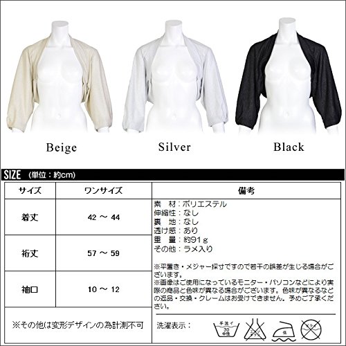 -. Feature : ボレロ 七分袖 ラメ カーディガン パーティー 結婚式 フォーマル 羽織 レディース / 【カラー】ブラック シルバー ベージュ / 【サイズ】 ■ワンサイズ ■着丈:42-44cm ■裄丈:57-59cm ■袖口:10-12cm (平置き採寸です。若干の誤差が生じる場合がございます。) / 【商品仕様】 ■伸縮性:なし  ■裏地:なし  ■透け感:あり / ドルマンスリーブ ラメボレロ ゆったりしたデザインなのに 綺麗なシルエットが魅力的なパーティーボレロ。パーティーや結婚式で落ち着いた 品のある女性に魅せてくれる一着です♪