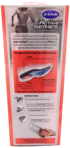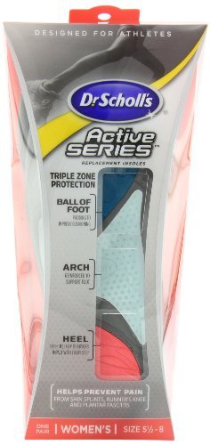 -. Binding : Health and Beauty -. Brand : Dr. Scholl's -. EAN : 0011017407362 -. Feature : Helps Prevent Pain from Shin Splints, Runner's Knee & Plantar Fasciitis / Triple Zone Protection / Ball of Foot - Padding to Improve Cushioning / Arch - Reinforced to Support Foot / Heel - Deep Heel Cup to Absorb Impact with Every Step -. Label : Dr. Scholl's -. Manufacturer : Dr. Scholl's -. MPN : 011017407362 -. PackageQuantity : 1 -. PartNumber : 011017407362 -. ProductGroup : Health and Beauty -. ProductTypeName : HEALTH_PERSONAL_CARE -. Publisher : Dr. Scholl's -. Studio : Dr. Scholl's -. Title : Dr. Scholl's Active Series Replacement Insole Women's, Size 5 1/2-8 (Pack of 3 Pairs) -. UPC : 011017407362