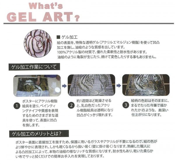 絵の表面に特殊ゲル加工が施されたアートフレームです。 製造国:日本 素材・材質:樹脂フレーム 商品サイズ:W55×H69.5cm 重量:約1.5kg 仕様:絵の表面を特殊ゲル加工壁掛用 付属品:壁掛用ひも ※サプライヤー直送品 ご注文後3~4営業日後の出荷となります