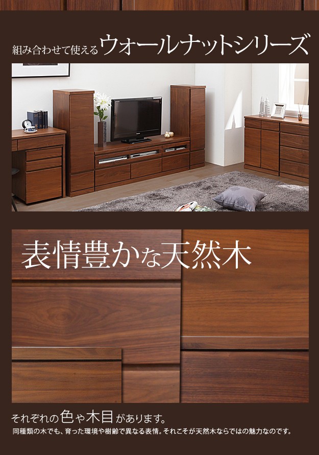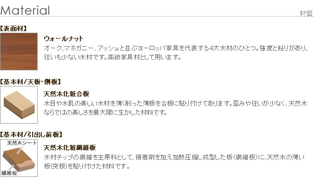 材質:天板・側板-天然木化粧合板(ウォールナット)、引出し前板-天然木化粧繊維板(ウォールナット)、フラップ扉枠-天然木(ウォールナット)、ガラス-強化ガラス、ウレタン樹脂塗装