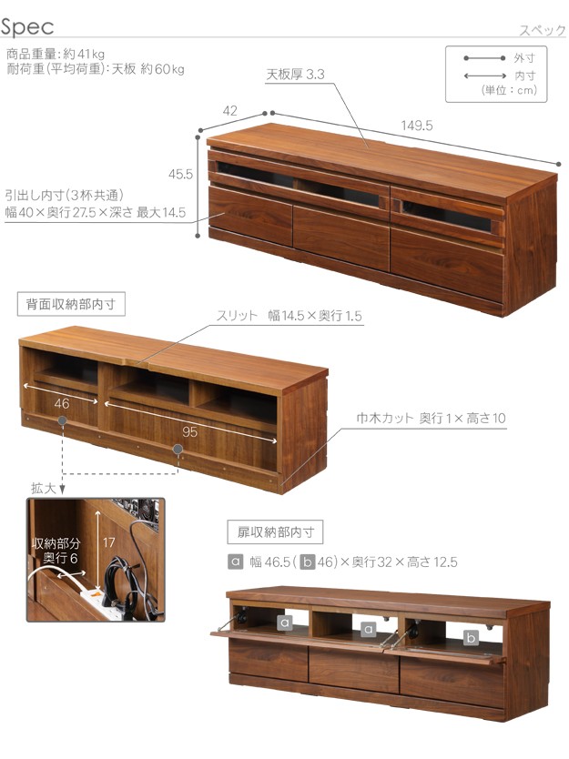 サイズ(cm):幅149.5x奥行42x高さ45.5cm・約41kg