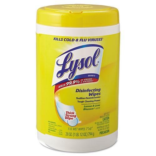 -. Feature : Reckitt Benckiser 78849 Disinfecting Wipes, Lemon & Lime, White, 7 x 8, 110/Canister, 6 Canisters/Carton / Each thick, pre-moistened wipe kills 99.9% of viruses and bacteria on hard nonporous surfaces when used as directed. Ideal for cleaning, disinfecting and deodorizing. Use on kitchen counters, appliances, stove tops, cabinets, floors, garbage cans, toilet exteriors, bathtubs and sinks.
