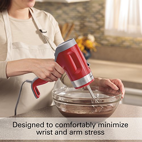 The Hamilton Beach ErgoMix Ergonomic Hand Mixer features a completely redesigned body for the ideal blend of comfort and control. The position of the handle allows you to keep your elbow lowered and your wrist in a neutral position while mixing.