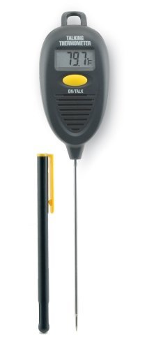 Studio : HOME-APP Publisher : HOME-APP Binding : Kitchen Product Description Not a novelty! This is a serious measurement tool that reads temperature with extreme speed and speaks the reading at the touch of its single large button. Other low-cost talking thermometers are made by companies that produce talking novelty items. They are cheaply made, very slow and not at all accurate. This thermometer was designed to our specification and is produced in a thermometer factory where each unit receives proper quality control and testing. ThermoWorks Super-Fast technology is employed in the reduced-tip probe for readings in only 5 or 6 seconds.* Turn the thermometer on, Insert the probe tip in a food portion or liquid, wait just a few seconds, then press the button to hear the temperature in a clear female voice. A recessed button on the back will change the scale from Fahrenheit to Celsius. Use the built-in eyelet at the top to hang the thermometer within easy reach where you normally use it. The thermometer body is contoured to comfortably fit the palm of your hand. Suitable for the sight impaired with partial or full vision loss. For the sighted, the large 3/8" digits are easier-to-read. Even those that can see the display need not take their eyes off other tasks if they can simply push the Talk button to tell them the temperature. Press it again and again to update the status of changing temperatures. The ThermoWorks Talking Thermometer is a tremendous aid in food preparation, general household use or even scientific and industrial applications. *Speed is measured as the time it takes to reach within 1 degree of the final temperature. Final tenths of a degree may continue to stabilize over the next 3 or 4 seconds. 0