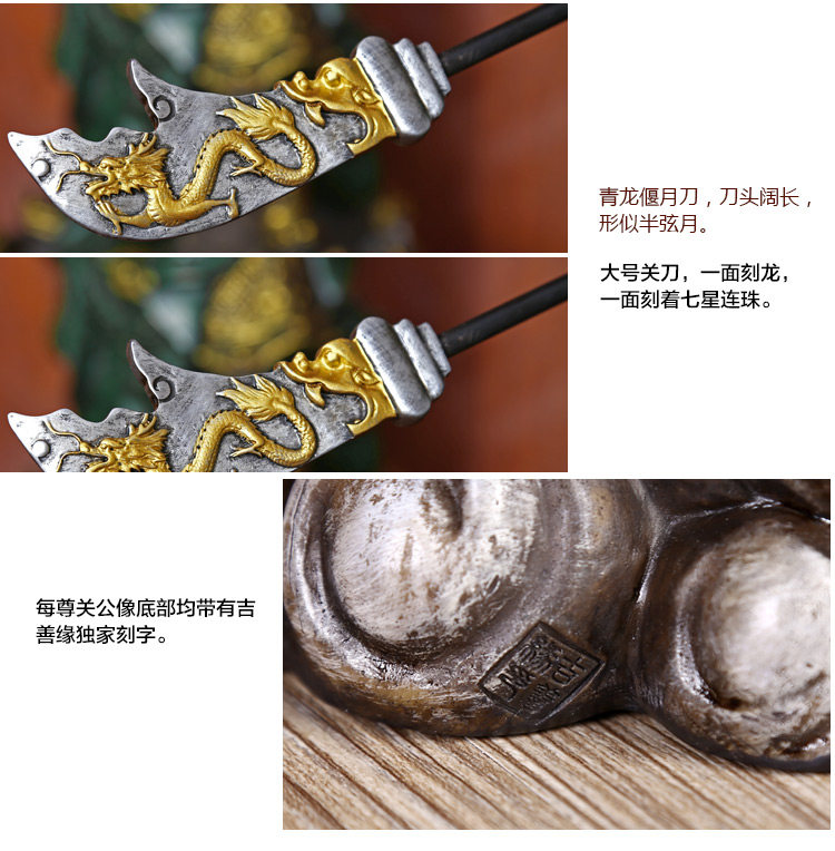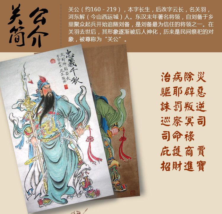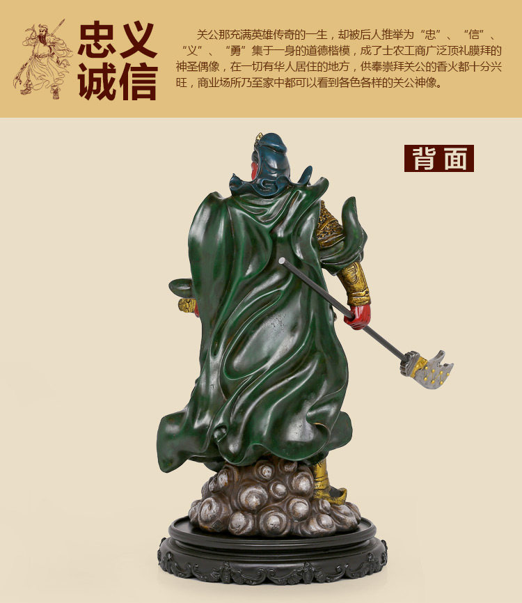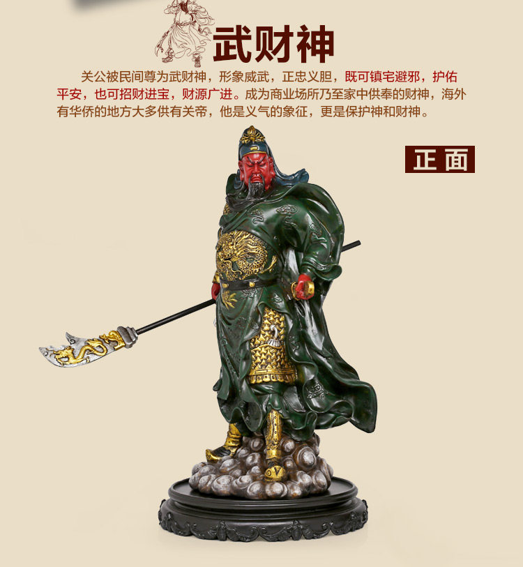 产品介绍: 关 羽亦称"关圣帝君",简称"关帝",本为道教的护法四帅之一,如今道教主要将他作为财神来供奉。关于,其职能除了"治病除灾,驱耶辟恶,诛罚叛逆,巡察冥 司",还有"司命禄,庇护商贾,招财进宝",又因其忠义,故被奉之为财神。商人认为关羽为财神的原因有三,一是说关公生前十分善于理财,长于会计业务,曾 设笔记法,发明日清簿,这种计算方法设有原、收、出、存四项,非常详明清楚,后世商人公认为会计专才,所以奉为商业神,二因商人谈生意作买卖,最重义气和 信用,关公信义俱全,故尊奉之,三因传说关公逝后真神常回助战,取得胜利,商人就是希望有朝一日生意受挫,能像关公一样,来日东山再起,争取最后成功。这 种信仰在清代,被各行各业所接受,对其顶礼膜拜尤盛。近代江湖上的哥老会、青红帮特别敬祀关帝,且江湖上结义弟兄,亦必于关帝前顶礼膜拜,焚表立誓,以守 信义。 |