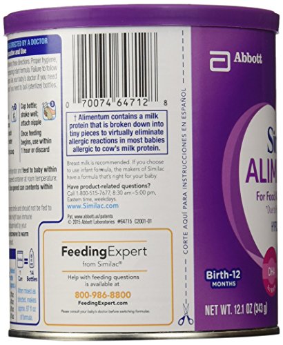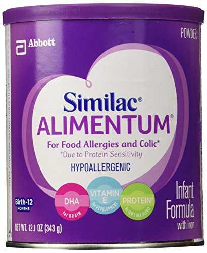 -. Binding : Health and Beauty -. Brand : Similac -. EAN : 0070074647159 -. Feature : Similac Expert Care Alimentum for food allergies and colic due to protein sensitivity / Lactose-free / Has a predigested milk protein that is broken down into tiny pieces to virtually eliminate allergic reactions in most babies allergic to cow's milk protein / For babies with colicky symp such as excessive crying and fussiness due to protein sensitivity / Generations of moms have put their trust in Similac -. IsAdultProduct : 0 -. Label : Abbott Laboratories -. Manufacturer : Abbott Laboratories -. NumberOfItems : 1 -. PackageQuantity : 1 -. ProductGroup : Health and Beauty -. ProductTypeName : HEALTH_PERSONAL_CARE -. PublicationDate : 2016-03-11 -. Publisher : Abbott Laboratories -. ReleaseDate : 2016-03-08 -. Studio : Abbott Laboratories -. Title : Similac Expert Care Alimentum Hypoallergenic Infant Formula with Iron, Powder, 12.1 Ounces (Pack of 6) -. UPC : 070074647159