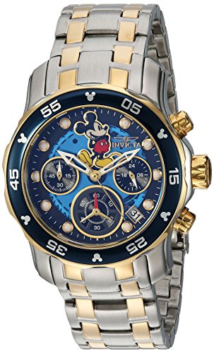 Invicta 24133 Disney Limited Edition chronograph women's dive watch features a 38mm wide and 13mm thick solid stainless steel case with a blue accented gold tone unidirectional rotating bezel and textured push-pull crown with function pushers. Invicta 24133 is powered by a reliable Japanese TMI VD53 quartz chronograph movement. This beautiful watch also features a sharp looking Mickey mouse printed blue dial with white accents gold tone luminous skeleton hands and dot hour markers along with the chronograph, 12/24-hour time and date display functions, scratch resistant flame fusion crystal and water resistant to 200 meters. Invicta 24133 is equipped with a 20mm wide two tone yellow gold plated solid stainless steel bracelet with a fold over safety lock clasp. Invicta 24133 women's Disney Edition chronograph blue dial two tone steel bracelet dive watch is brand new and comes in an original Invicta gift box and is backed by a 5 year limited warranty.Feature