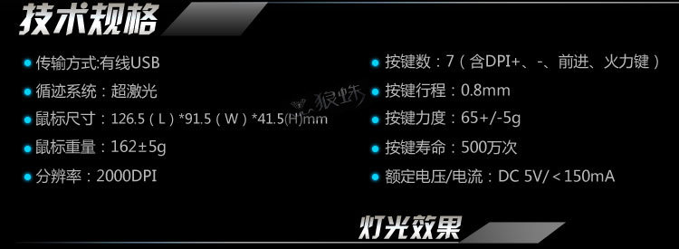 鬼鲛鼠标尺寸:12.6*9.5*4 cm(长*宽*高),重量162g,线长180cm。
