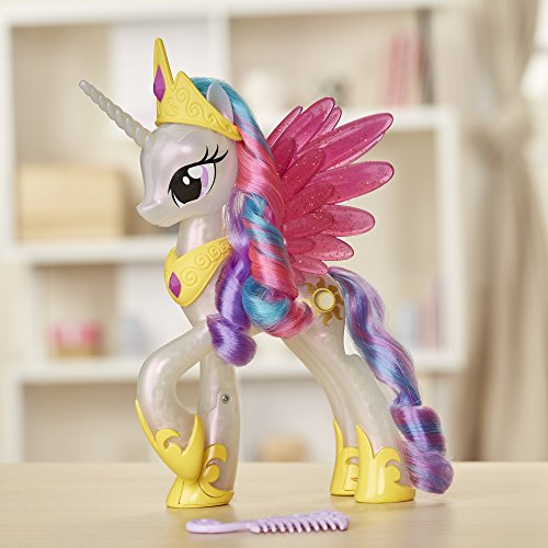 Princess Celestia brightens everypony’s day as she lights up Equestria! Light up movie-inspired adventures with this Glitter and Glow Princess Celestia figure. Press her sun-shaped cutie mark and watch her lights twinkle and change colors. Dress her up with her tiara and necklace to help her look her best and pretend she's attending the Friendship Festival! My Little Pony and all related terms are trademarks of Hasbro. My Little Pony: The Movie. Copyright 2017 My Little Pony Productions, LLC. Licensed by Hasbro.Feature