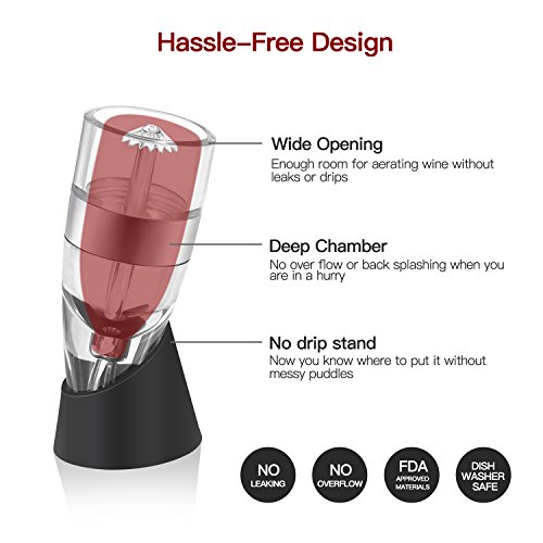 More Effective Aeration. Patented multi-stage design ensures 4x more effective aeration, the umbrella-shaped top and acrylic pour spout in the mixing cavity enable wine to contact air for multiple times, avoid blocking the gas inlet tube, and obstructs dust.. No Leaking, No Dripping, No Overflow, No Neck Leaking No worry any more about leaks or drips from the aerator when you pour wine too quickly. No overflow problems when you pour wine too quickly into an aerator with a small cavity No neck leaking or fitting problems found in pourer-style aerators