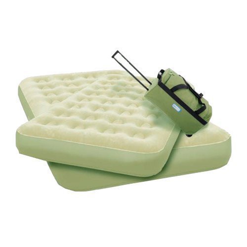 -. Binding : Apparel -. Brand : AeroBed -. Color : Green -. EAN : 0760433642252 -. Feature : Inflating and deflating time is less than 60 seconds / Both beds store in wheeled travel bag, plus bonus one strap carry bag allows you to easily transport one bed as needed / One external AC powered pump / Air coil construction supports evenly all night long / Materials: PVC vinyl -. Label : Aerobed -. Manufacturer : Aerobed -. Model : 64225 -. MPN : 64225 -. PackageQuantity : 1 -. PartNumber : 64225 -. ProductGroup : Apparel -. ProductTypeName : BAG -. Publisher : Aerobed -. Size : Queen and Twin -. Studio : Aerobed -. Title : Aerobed 64225 Family Travel Pack Queen and Twin Mattresses w Rolling Duffle Bag -. UPC : 760433642252