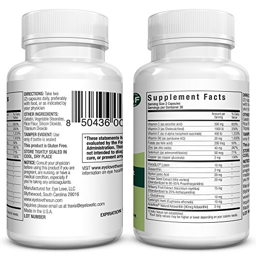 -. Feature : ENHANCES EYE HEALTH AND VISION - Lutein and Zeaxanthin cross the blood-brain barrier and work alongside other vitamins and minerals to ensure macular health and function for a lifetime. The health of the macula determines our ability to read, recognize faces, drive, watch television, use a computer, and perform any other visual task that requires us to see fine detail. / HOW WE ARE DIFFERENT - For every supplement sold, we give an exam, sunglasses, and glasses to someone in need. This is on top of our 100% satisfaction guarantee, which means that if you are not happy with your purchase, we will give you a full refund. JOIN THE MOVEMENT! / SUPPORTS THE RETINA WITH 14 OPTIMAL NUTRIENTS - The Retina is important for capturing what you see on a daily basis. Vitamin C, Vitamin D, Vitamin E, Zinc, Copper, Selenium, Vitamin B-6, Folate, Lutein, Zeaxanthin, Bilberry, Alpha-Lipoic Acid, Grapeseed Extract, and L-Glutathione are all it takes. / HELPS MAINTAIN HEALTHY MACULAR PIGMENT - Potent carotenoids within this formulation increase overall macular pigment density and this supports overall eye health. / EASY TO USE - Just 2 capsules per day fights aging eyes and preserves your best vision.