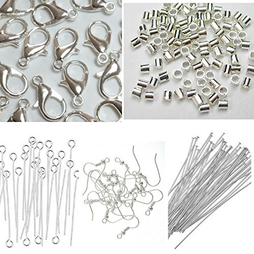 This jewelry findings starter set includes things you need to get started on making earrings, necklaces, bracelets, charms and more. Supply the tools and accessories you would need. Components Seed Beads Qty: Lobster Clasp Qty 10: Brass Lobster Claw Clasps 13x8x3mm Eye Pins Qty: 50 Brass Eye pins, silver 50x0.7mm, Hole: 2mm Crimp Beads Qty: 10 g Brass Tube Crimp Beads, silver 1.5mm, Hole: 1mm Ear Ring Hooks Qty: 10 Brass Earring Hooks, silver 18x19mm, Hole: 2mm; Pin: 0.7mm Head Pins Qty: 50 Iron Headpins, silver 50x0.7mm