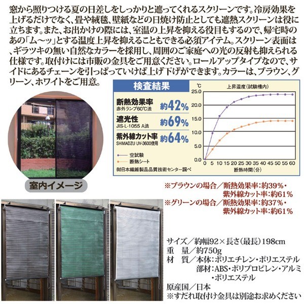 窓から照りつける夏の日差しをしっかりと遮ってくれるスクリーンです。冷房効果を上げるだけでなく、畳や絨毯、壁紙などの日焼け防止としても遮熱スクリーンは役に立ちます。また、お出かけの際には、室温の上昇を抑える役目もするので、帰宅時のあの「ム~ッ」とする温度上昇を抑えることもできる必須アイテム。スクリーン表面は、ギラツキの無い自然なカラーを採用し、周囲のご家庭への光の反射も抑えられる仕様です。取付けには市販の金具をご用意ください。ロールアップタイプなので、サイドにあるチェーンを引っぱっていけば上げ下げができます。カラーは、ブラウン、グリーン、ホワイトをご用意。