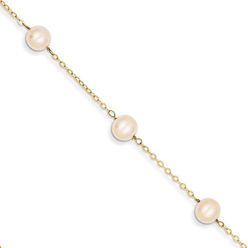 Anklet Type: Anklets with StationsMaterial: Primary: GoldMaterial: Primary - Color: YellowMaterial: Primary - Purity: 14KFinish: PolishedChain Length: 9 inChain Width: 7 mmClasp /Connector: Spring RingStone Type_1: PearlPearl Type_1: FreshwaterStone Creation Method_1: CulturedStone Treatment_1: BleachingStone Color_1: White