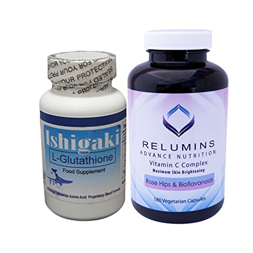 -. Feature : Authentic Ishigaki L-Glutathione Ultra-Whitening Formula & Relumins Vitamin C MAX Capsules Stack: Advanced Ultrawhite Amino Acid Blend & Vitamin C Complex. / Ishigaki L-Glutathione Ultra Whitening Formula - 60 softgel capsules (30 day supply). Contains 600mg of L-Glutathione per Capsule, 3 Times as Much as Ivory Caps. Also contains 200mg of L-Glutathione booster, which increases the efficacy of the Glutathione. / Relumins Vitamin C MAX Complex - 180 Vegetarian Capsules, (90 day supply) 100% Natural Brightening Supplement, Halal and cGMP Certified. Assists in the absorption and utilization of Glutathione and other nutrients. Vitamin C from several sources optimized to provide enhance benefits. / Relumins Vitamin C Maximum Skin Brightening is like no other supplement because it has been specially developed to enhance the effectiveness of skin brightening by providing nutritional support though a unique blend of highly bio-available Vitamin C from several sources along with proven antioxidants, herbs and vitamins commonly used to benefit skin brightening. / Using the Relumins Vitamin C with the Ishigaki L-Glutathione Capsules will give you amazing results!