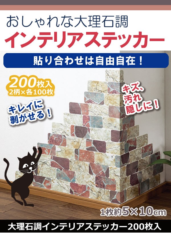 | <h1>お部屋の雰囲気を変えたい…壁のキズや汚れが気になる…そんな時に大理石調のインテリアステッカー!2柄組、200枚入りだからたくさん使えて便利!表面は大理石を転写したリアルな仕上がりに!角にもきれいに貼れちゃいます。リビング、玄関はもちろんキッチンまわりにも。収納BOXにも使えます。貼り合わせは自由自在であなたのお気に入りのお部屋を作って下さい!</h1> |