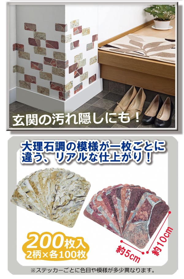 | おしゃれな大理石調インテリアステッカー。人気の木目調から新デザイン登場。簡単に貼れてキレイに剥がせるから手軽にお部屋の雰囲気を変えたい時!キズ、汚れ隠しにも。貼り合わせは自由自在でリビング、玄関はもちろんキッチンにも。表面は大理石を転写したリアルな仕上がりに。2柄組の200枚入りだからたくさん使えて便利!あなたのセンスでこだわりのお部屋を作って下さい!! |