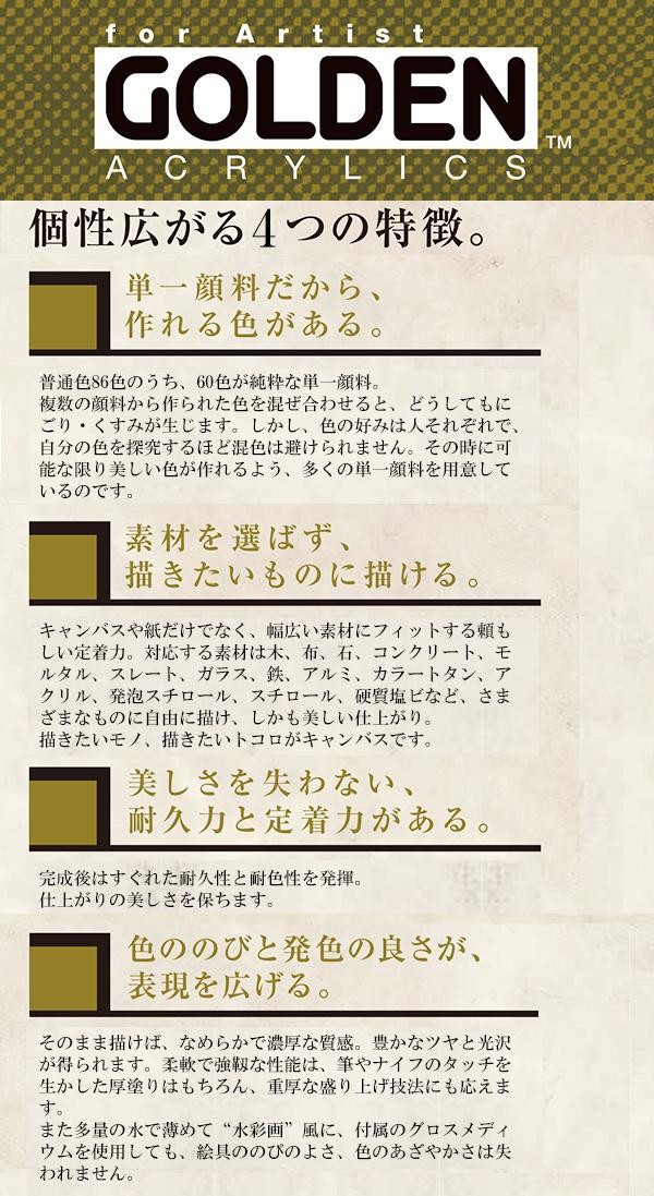 | ゴールデンアクリリックスは、普通色全85色のうち60色が、純粋な単一の顔料で作られています。理由は混色をする時ににごりのない・美しい混色ができるように。そして、水やメディウムで薄めても、鮮やかな発色が保たれるように。残りの普通色25色は、グレーや鮮やかな黄緑・パステル色など、混ぜ合わさなければ作れない色。あるいは色の深みを増すために、あえて異なる顔料を加えた色などです。 |